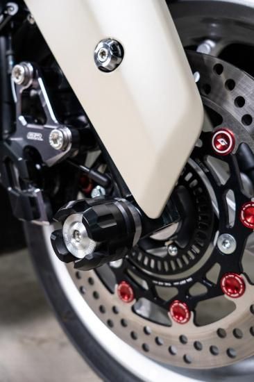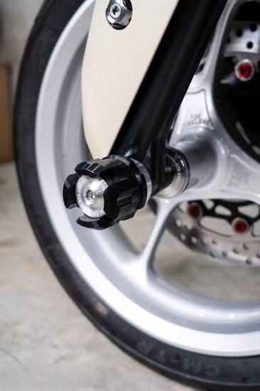 ヤマハ NMAX(2025年モデル)に対応したフロントフォークスライダーです。転倒時のダメージを軽減し、フェンダーやサスペンション周辺の保護をしながら、車体の足元にスタイリッシュなアクセントを加える人気のカスタムパーツです。